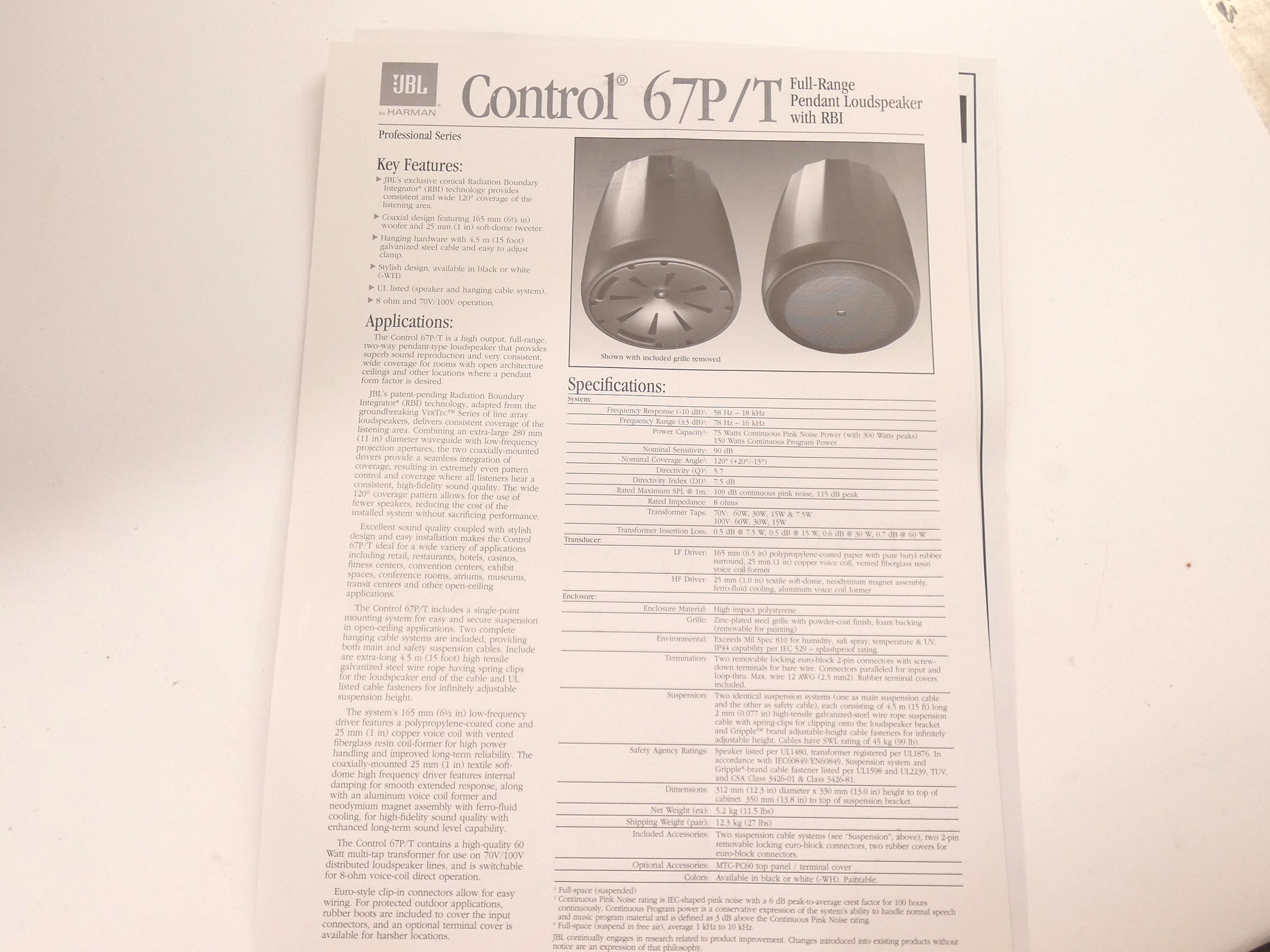 *Pair* JBL C67P/T-WH Full-Range Pendant Speaker 70/100V 60W